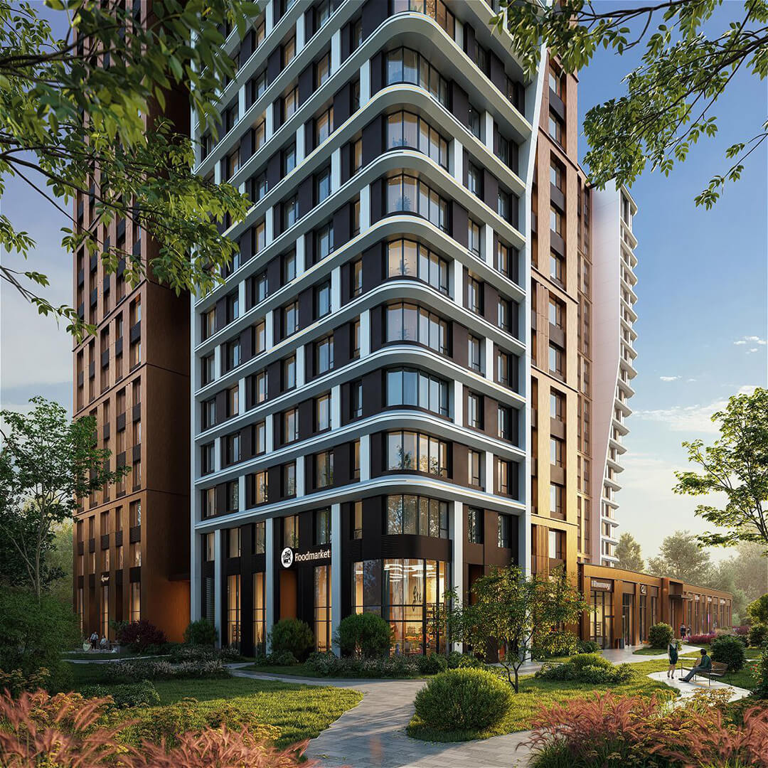 Два высотных корпуса гармонично вписываются в окружающую среду, а приватный двор-парк с тематическими зонами, искусственным водоемом и авторским ландшафтом дополняет уютную атмосферу. Для жителей спроектированы детские и спортивные площадки, места для отдыха и прогулок, а также отдельные зоны для работы и общения на свежем воздухе. Архитектура комплекса ориентирована на комфорт и удовлетворение потребностей жителей, сочетая эстетичность, функциональность и передовые технологии.